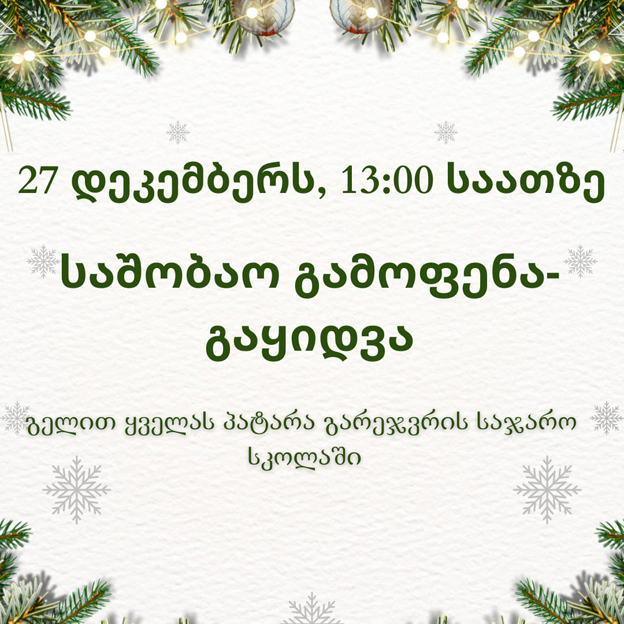 გორის მუნიციპალიტეტის სოფელ პატარა გარეჯვრის საჯარო სკოლაში 27 დეკემბერს საშობაო გამოფენა-გაყიდვა მოეწყობა.