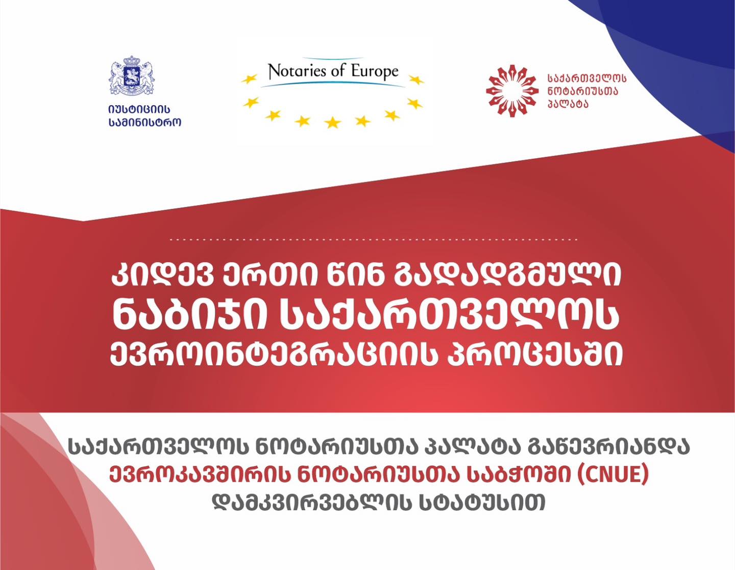 ევროკავშირის ნოტარიუსთა საბჭოს (CNUE) გენერალურმა ასამბლეამ, რომელიც ევროკავშირის 22 ქვეყნის ეროვნული ნოტარიატების წარმომადგენლებისგან შედგებოდა, ერთხმად დააკმაყოფილა საქართველოს ნოტარიუსთა პალატის აპლიკაცია ევროკავშირის ნოტარიუსთა საბჭოში საქართველოს ნოტარიუსთა პალატის დამკვირვებლის სტატუსით გაწევრიანების თაობაზე.