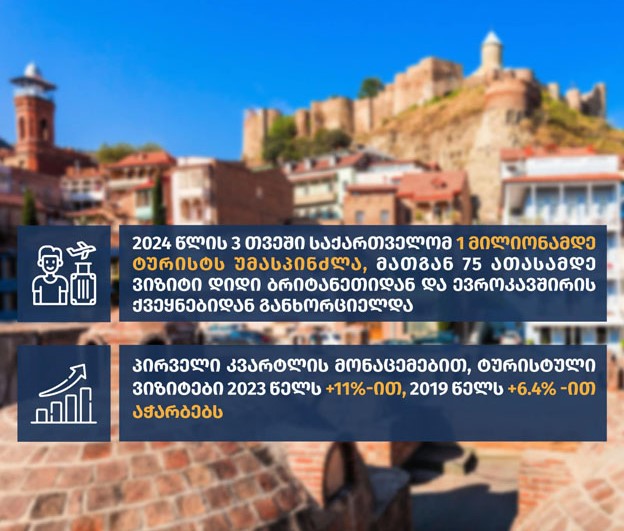 „2024 წლის პირველ კვარტალში, საქართველოში ყველაზე მეტი ვიზიტი პოლონეთიდან დაფიქსირდა, რაც 2019 წლის მონაცემებს +67.1%-ით აჭარბებს, შემდეგ მოდის გერმანია (2019 წელთან შედარებით ზრდა 46.1%); გაერთიანებული სამეფო (ზრდა 2019 წელთან 27%.) და ა. შ. გაზრდილია მაღალმხარჯველი ტურისტული ბაზრებიდან ვიზიტების ოდენობაც: ყურის ქვეყნებიდან საქართველოში 27.9%-ით მეტი ვიზიტი განხორციელდა 2019 წლის ანალოგიურ პერიოდთან შედარებით, ხოლო 2023 წლის მონაცემებთან შედარებით ზრდა 21.6% -ია. 2019 წლის მონაცემებთან შედარებით გაზრდილია საუდის არაბეთიდან ვიზიტორთა რაოდენობა 33.5%-ით, ხოლო ქუვეითიდან ვიზიტები - 66.3%-ით“, - აცხადებენ ეკონომიკისა და მდგრადი განვითარების სამინისტროში.