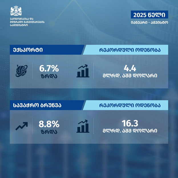 2025 წლის იანვარი-აგვისტოს მონაცემებით, ექსპორტი 6.7%-ით გაიზარდა და რეკორდულ ოდენობას 4.4 მლრდ. აშშ. დოლარს გაუტოლდა, - ინფორმაციას ეკონომიკისა და მდგრადი განვითარების სამინისტრო ავრცელებს.