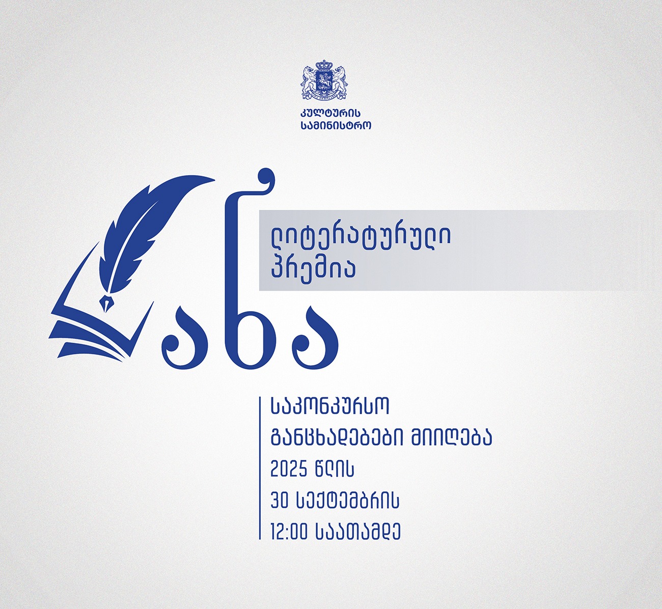 საკონკურსო განცხადებების მიღება 2025 წლის 30 სექტემბრის 12:00 საათამდე სამინისტროში (მისამართი: თბილისი, სანაპიროს ქ. N4), ნაბეჭდი სახით ან სამინისტროს ოფიციალურ ელექტრონულ ფოსტაზე (info@culture.gov.ge) ელექტრონულადაა შესაძლებელი. კონკურსში გამარჯვებულთა დაჯილდოების ცერემონია კი მიმდინარე წლის დეკემბერში გაიმართება.