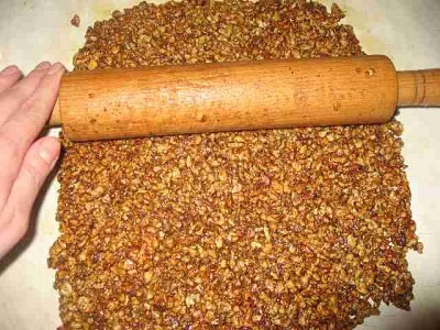 სქელძირიან ღრმა ტაფაში ჩავასხათ თაფლი და დავდგათ დაბალ ცეცხლზე, თან გამუდმებით ვურიოთ. თაფლი როგორც კი დუღილამდე მივა და აქაფდება, ცეცხლიდან გადმოვდგათ. ცოტა ხანში ისევ შევდგათ ცეცხლზე და ასე გავიმეოროთ სამჯერ. მესამედ გაცივების შემდეგ თაფლი ისევ დავდგათ ცეცხლზე და დავაყაროთ ნიგოზი. დავუმატოთ შაქარი. კარგად ავურიოთ ერთმანეთში და გავაჩეროთ რამდენიმე წუთი. გადმოვიღოთ სველ დაფაზე და დავიწყოთ გაბრტყელება სველი გასაბრტყელებლით. საჭიროა სწრაფად გავაბრტყელოთ, რომ თაფლი არ გაგვიცივდეს და მალევე დავჭრათ, თორემ გაცივების შემდეგ გამაგრდება და დაჭრაც გაძნელდება.