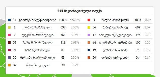 ცესკო-ს ოფიციალურ გვერდზე ამ დროისთვის არსებული ინფორმაციით, 2020 წლის 31 ოქტომბრის საპარლამენტო არჩევნების წინასწარი მონაცემებით, გორის #15 მაჟორიტარულ ოლქში ,,ქართული ოცნება-დემოკრატიული საქართველოს“ მაჟორიტარი კანდიდატი გიორგი ხოჯევანიშვილი ლიდერობს. წინასწარი მონაცემებით, ხოჯევანიშვილს ამომრჩეველთა ხმების 56.28% აქვს მიღებული, 28.07 % მიიღო ,,ერთიანი ნაციონალური მოძრაობის“ მაჟორიტარობის კანდიდატმა ბადრი ბასიშვილმა.