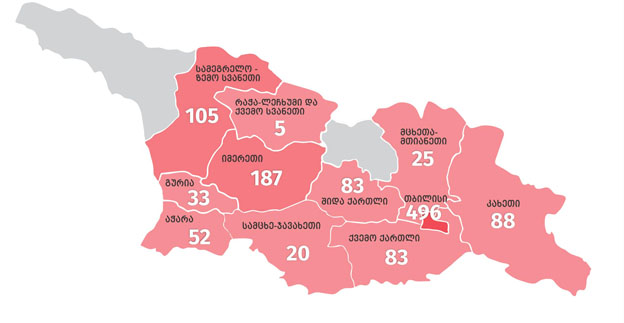 ვირუსის გავრცელების მაჩვენებლები დედაქალაქისა და რეგიონების მიხედვით გამოიყურება შემდეგი სახით: თბილისში გამოვლენილია 496 შემთხვევა, აჭარა - 52, იმერეთი - 187, ქვემო ქართლი - 83, შიდა ქართლი - 83, გურია - 33, სამეგრელო და ზემო სვანეთი - 105, კახეთი - 88, მცხეთა-მთიანეთი - 25, სამცხე-ჯავახეთი - 20, რაჭა-ლეჩხუმი და ქვემო სვანეთი - 5.