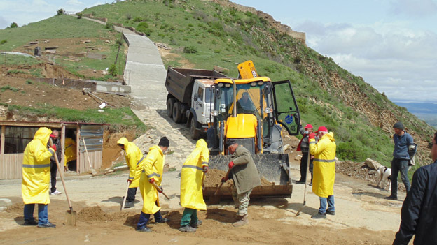 სააგენტოს თანამშრომლებმა ფერდობიდან ჩამოშლილი მიწის მასისგან გაწმინდეს და წყლის ჭავლით გადარეცხეს ტაძარამდე მისასვლელი საავტომობილო გზა და სანიაღვრე არხები.