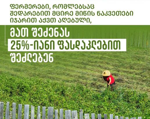 საქართველოს მთავრობის გადაწყვეტილებით, ფერმერებს, რომლებსაც შედარებით მცირე მიწის ნაკვეთები იჯარით აქვთ აღებული და ამ მიწის გამოსყიდვა სურთ, გარკვეული შეღავათები დაუწესდებათ. GMnews-ის ინფორმაციით, სახელმწიფო პროგრამით მოსარგებლეები, დროებით სარგებლობაში არსებული სასოფლო-სამეურნეო დანიშნულების მიწის ფართების შეძენას 25%-იანი ფასდაკლებით შეძლებენ.