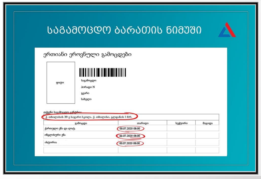 აღნიშნულ დოკუმენტზე დატანილია შემდეგი ინფორმაცია: საგამოცდო ცენტრის მისამართი, თითოეული გამოცდის თარიღი, გამოცდაზე რეგისტრაციის დაწყების დრო და ის რეკომენდაციები, რომლებიც უნდა გაითვალისწინოს თითოეულმა გამოსაცდელმა.