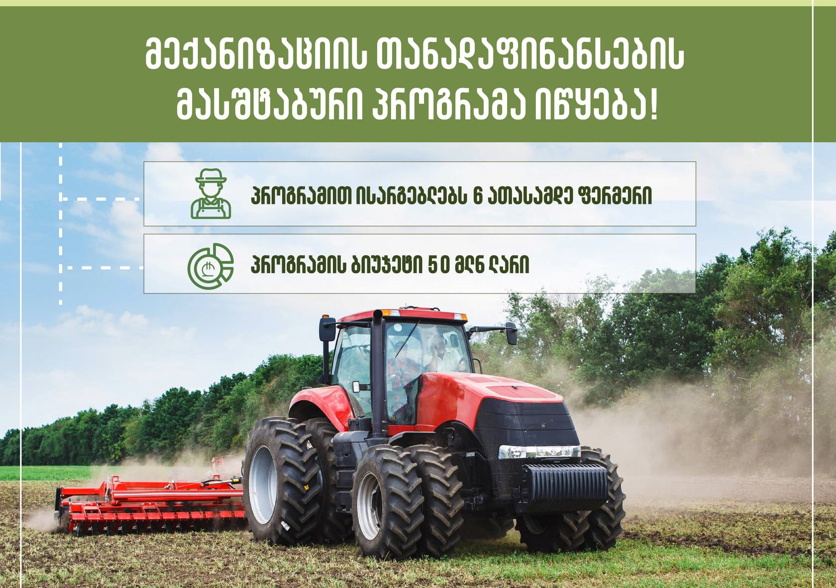 სასოფლო-სამეურნეო მექანიზაციის მასშტაბური თანადაფინანსების პროგრამა იწყება. მთავრობის ინფორმაციით, პროგრამით, რომლის ბიუჯეტიც 50 მლნ ლარს შეადგენს, 6 000-მდე ფერმერი ისარგებლებს.