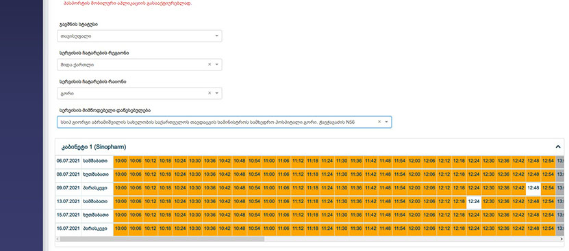 ამ დროისთვის, ვაქცინაციის რეგისტრაცია გორში შესაძლებელია მხოლოდ სამხედრო ჰოსპიტალში, სადაც ამ დროის მონაცემებით მხოლოდ 2 თავისუფალი ადგილია დარჩენილი.