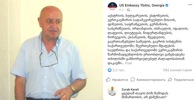 შეგახსენებთ, რომ 5 ივლისს, „ღირსების მარშის“ წევრებსა და სამოქალაქო პირებს შორის მომხდარი დაპირისპირების ფაქტზე, რა დროსაც ფიზიკური შეურაცხყოფა მიაყენეს ათობით ჟურნალისტს, აშშ-ის სალჩოს მიერ გავრცელებულ განცხადებაზე ზურაბ ქარელმა არაეთიკური კომენტარი გააკეთა.