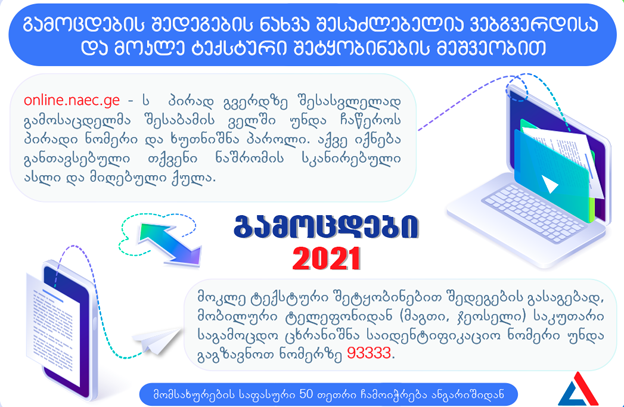 რაც შეეხება მოკლეტექსტური შეტყობინებით ქულის გაგებას, აბიტურიენტმა მობილური ტელეფონიდან (მაგთი, ჯეოსელი) საკუთარი საიდენტიფიკაციო კოდი (ბარათზე მითითებული ცხრა ნიშნა რიცხვი) უნდა გაგზავნოს ნომერზე 93 333 (საფასური 50 თეთრი ჩამოიჭრება ანგარიშიდან).