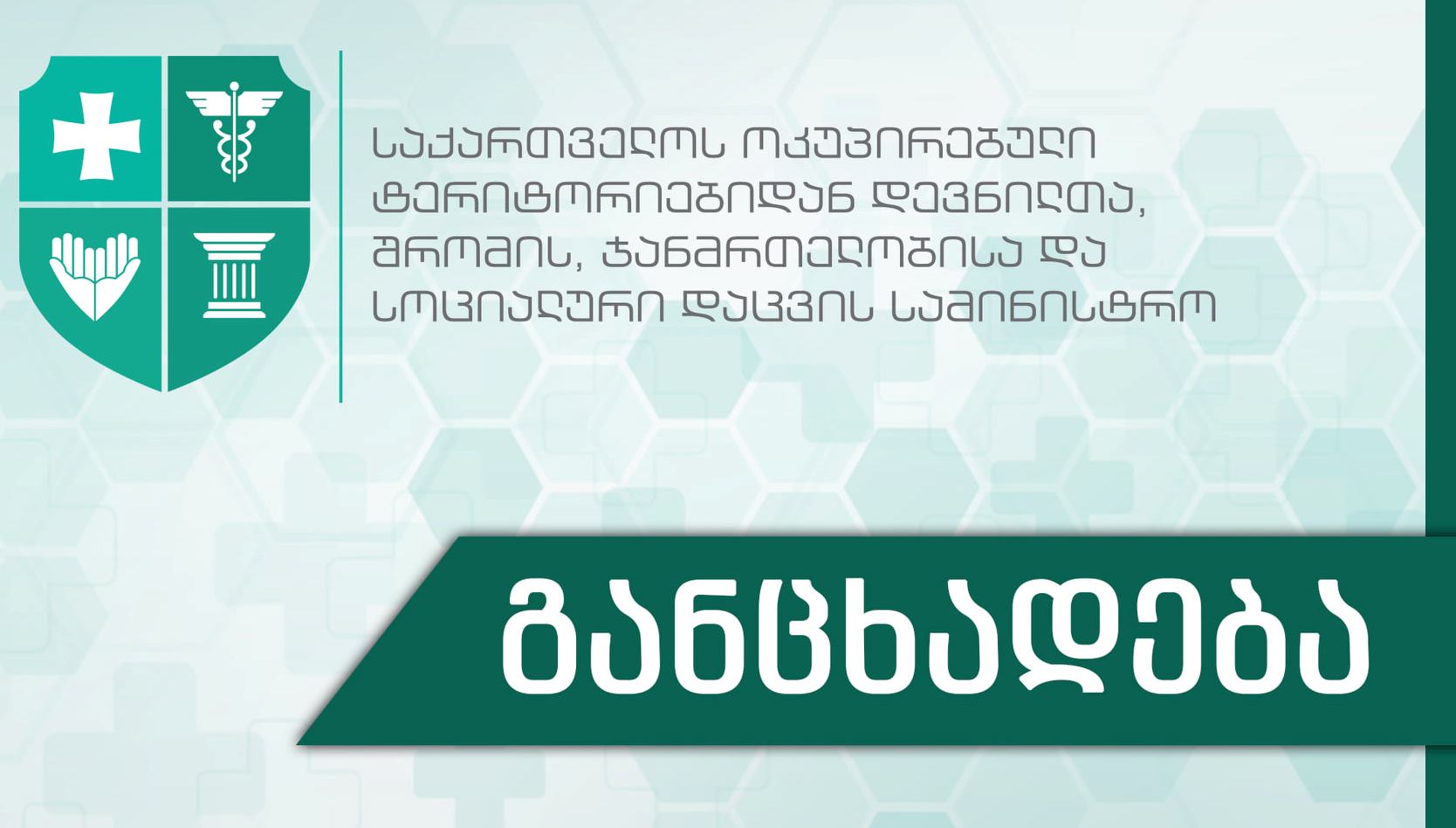 საქართველოს ოკუპირებული ტერიტორიებიდან დევნილთა, შრომის, ჯანმრთელობისა და სოციალური დაცვის სამინისტრო მიმართავს მოსახლეობას, ვაქცინაზე უარის შემთხვევაში, მიზეზის დაფიქსირება მოითხოვეთ წერილობითი ფორმით და აღნიშნული დოკუმენტი, თქვენივე ხელმოწერილ განცხადებასთან ერთად გადმოგზავნეთ სამედიცინო და ფარმაცევტული საქმიანობის რეგულირების სააგენტოს მეილზე regagency @ moh.gov.ge, განცხადების შემოტანა ასევე შეგიძლიათ ადგილზე, სამინისტროს მოქალაქეთა მისაღებში. განცხადების დაფიქსირების შემდეგ, რეგულირების სააგენტო შეისწავლის თუ რამდენად საფუძვლიანი იყო ექიმის გადაწყვეტილება და იყო თუ არა პაციენტის მდგომარეობა აცრის უკუჩვენება. შეგახსენებთ, არსებული პანდემიის პირობებიდან და ინფიცირების მაღალი მაჩვენებლიდან გამომდინარე ვაქცინაცია უალტერნატივოა და ყველაზე მნიშვნელოვანი იარაღია ადამიანის სიცოცხლისა და ჯანმრთელობის დასაცავად“, - ნათქვამია გავრცელებულ ინფორმაციაში.