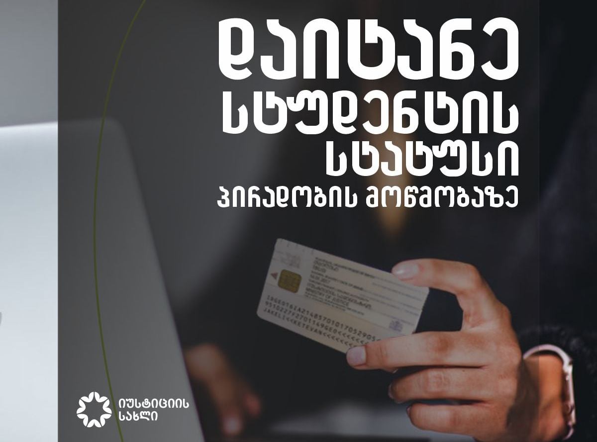 „იუსტიციის სახლი ყველა სტუდენტს ულოცავს სტუდენტობას და სთავაზობს სიახლეს - დაიტანონ სტუდენტის სტატუსი პირადობის ელექტრონულ მოწმობაზე და ისარგებლონ შეღავათებით. ფასდაკლებებით სარგებლობა შეგიძლიათ თეატრის, კინოსა და მატარებლის ბილეთების შეძენისას, მუზეუმებსა და ბოტანიკურ ბაღებში. ასევე, კერძო კომპანიების ინდივიდუალური შეთავაზებებისას“, - აცხადებენ უწყებაში.