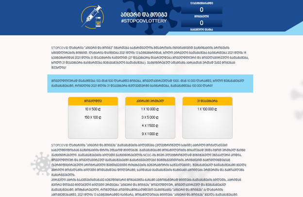 საქართველოში ვაქცინირებული პირებისთვის ლატარიის გათამაშებები დღეიდან დაიწყო. საქართველოს ეროვნული ლატარიის კომპანიის მიერ გავრცელებული ინფორმაციის მიხედვით, ყოველდღე გათამაშდება 100 და 500 ლარი, ყოველკვირეულად - 1000-დან 10 000 ლარამდე, ხოლო შემაჯამებელი გათამაშება, 31 დეკემბერს „საქართველოს საზოგადოებრივი მაუწყებლის“ ეთერში გაიმართება, სადაც მოქალაქეებს 100 000 ლარის მოგება შეეძლებათ. ლატარიაში ჩასართავად არაფერია საჭირო, გარდა კოვიდსაწინააღმდეგო ვაქცინაციის ჩატარებისა.