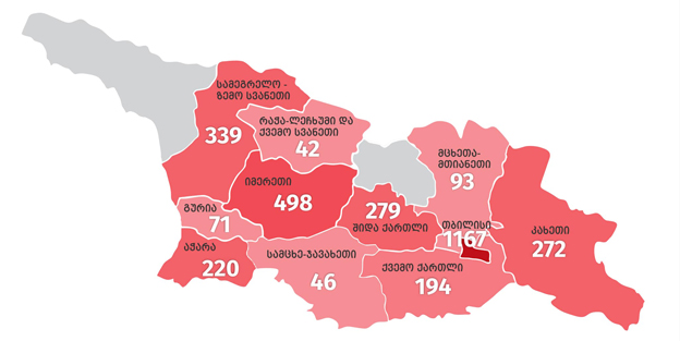 დღეს ქვეყანაში გამოვლენილი ინფიცირების 3 221 ახალი შემთხვევიდან თბილისში გამოვლენილია 1 167 შემთხვევა, აჭარა - 220, იმერეთი - 498, ქვემო ქართლი - 194, შიდა ქართლი - 278, გურია - 33, სამეგრელო - ზემო სვანეთი - 339, კახეთი - 272, მცხეთა-მთიანეთი - 93, სამცხე-ჯავახეთი - 46, რაჭა-ლეჩხუმი და ქვემო სვანეთი - 42.