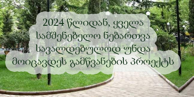 საქართველოს პარლამენტი „სივრცითი მოწყობის შესახებ კოდექსში“ ცვლილებებს დღევანდელ პლენარულ სხდომაზე მესამე მოსმენით დაამტკიცებს. ცვლილების თანახმადს, 2024 წლიდან, საქართველოში გაცემული ყველა სამშენებელო ნებართვა სავალდებულოდ უნდა მოიცავდეს გამწვანების პროექტს.