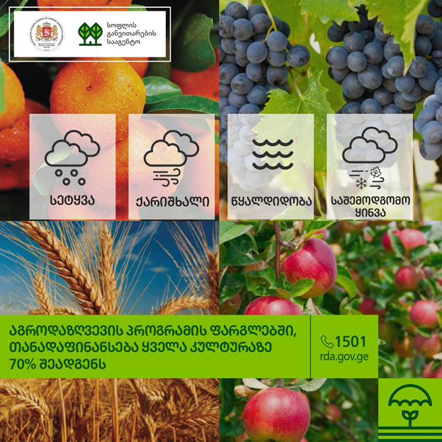 „თქვენ შეგიძლიათ, დროულად დაიჭიროთ თადარიგი და დააზღვიოთ მოსავალი ისეთი სტიქიური მოვლენებისგან, როგორებიცაა: სეტყვა, წყალდიდობა, ქარიშხალი, საშემოდგომო ყინვები (მოლოდ ციტრუსოვანი კულტურებისთვის - 1 სექტემბრიდან 30 ნოემბრის ჩათვლით პერიოდში). დამზღვევს შესაძლებელია დაზღვეული ჰქონდეს როგორც მარცვლეული კულტურა, ისე სხვა კულტურები ერთდროულად“, - ნათქვამია სოფლის განვითარების სააგენტოს მიერ გავრცელებულ ინფორმაციაში.
