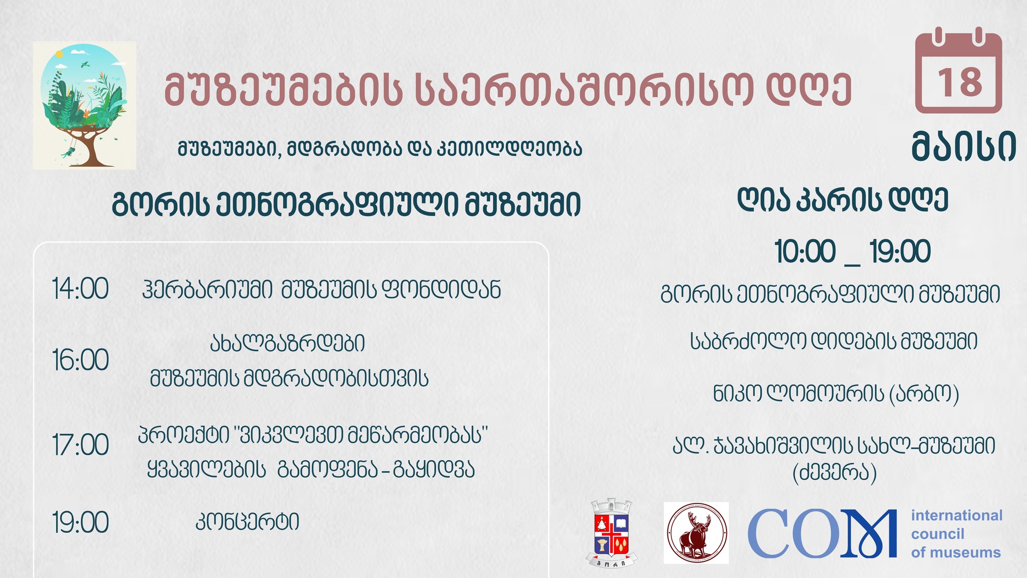 დღეს, 18 მაისს, მუზეუმების საერთაშორისო დღესთან დაკავშირებით, გორის მუნიციპალიტეტში არსებულ მუზეუმებში არაერთი ღონისძიებაა დაგეგმილი.