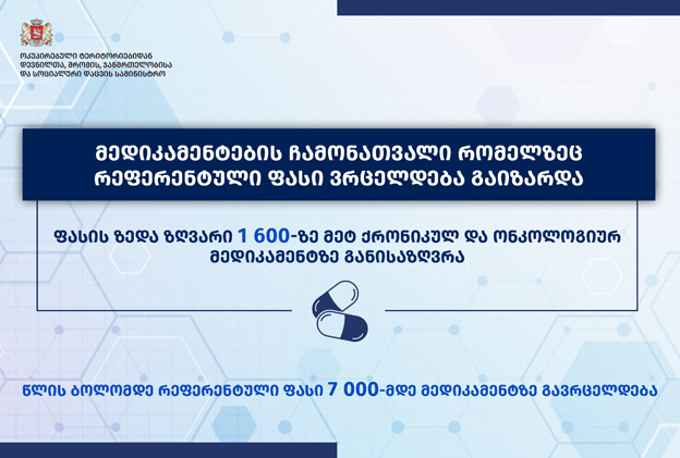 უწყების ინფორმაციით, რეფერენტული ფასწარმოქმნის მექანიზმი წლის ბოლომდე 7000-მდე მედიკამენტზე გავრცელდება.