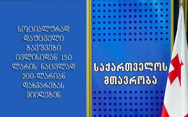 საქართველოს მთავრობის გადაწყვეტილებით, 2023 წლის 1-ლი ივლისიდან, სოციალურად დაუცველი ბავშვები 150 ლარის ნაცვლად 200-ლარიან დახმარებას მიიღებენ.