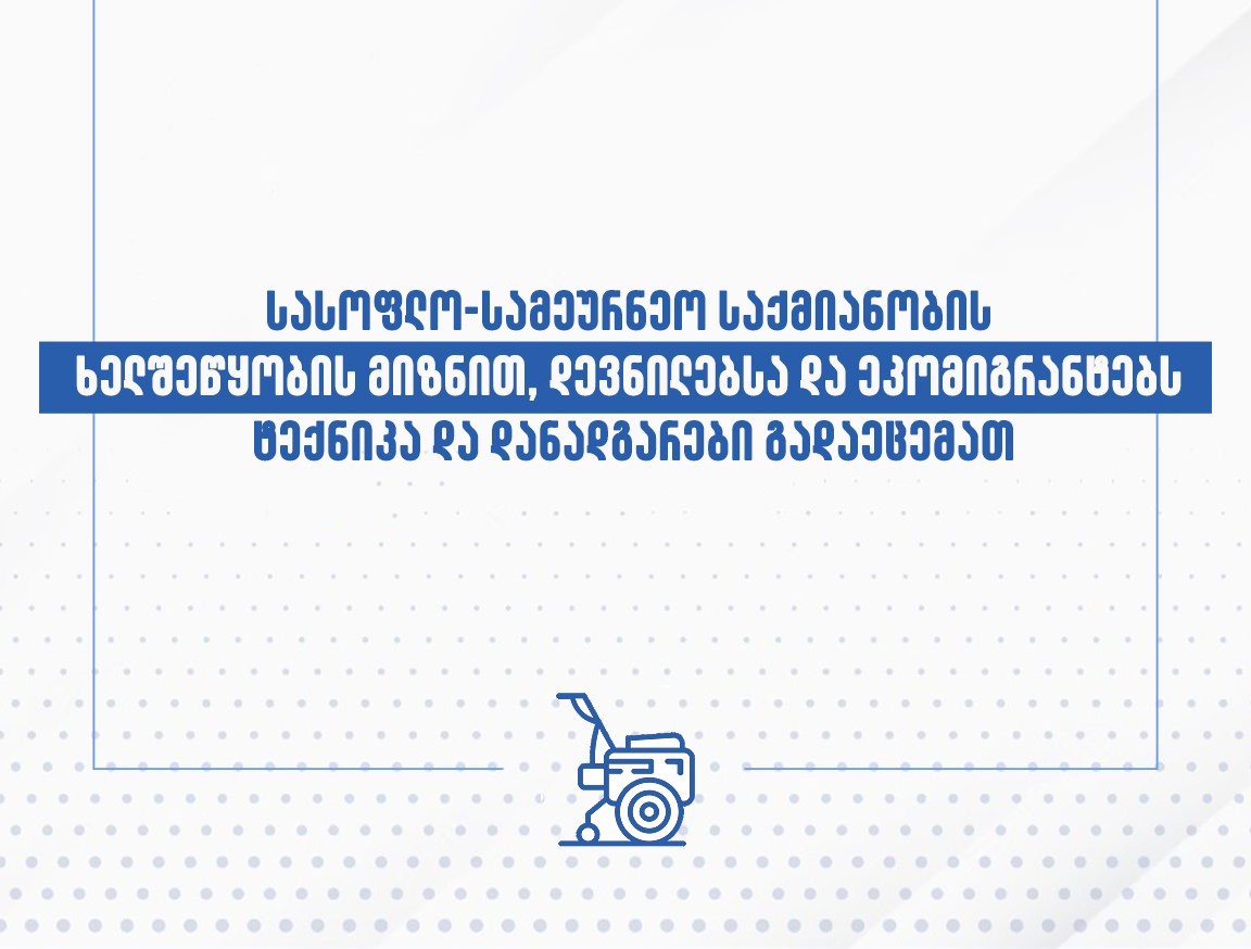 დევნილებსა და ეკომიგრანტებს სასოფლო-სამეურნეო საქმიანობის, სურსათის წარმოებისა და გადამუშავების ხელშეწყობის მიზნით ტექნიკა და დანადგარები გადაეცემათ.