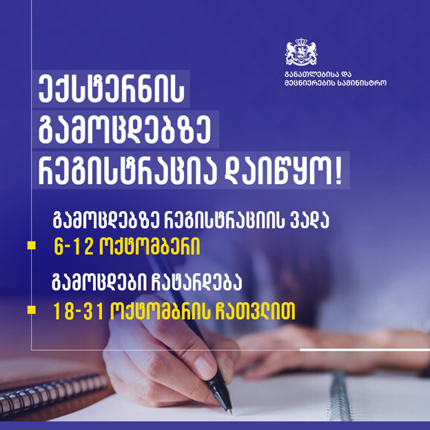 ზოგადი განათლების I-XI კლასის/კლასების და სემესტრის, ასევე I-XI კლასში/სემესტრში შემავალი საგნის/საგნების და ზოგადსაგანმანათლებლო სასწავლო პროგრამის/პროგრამების ექსტერნატის ფორმით დაძლევის გამოცდაზე რეგისტრაცია დაიწყო, - ინფორმაციას საქართველოს განათლებისა და მეცნიერების სამინისტრო ავრცელებს.
