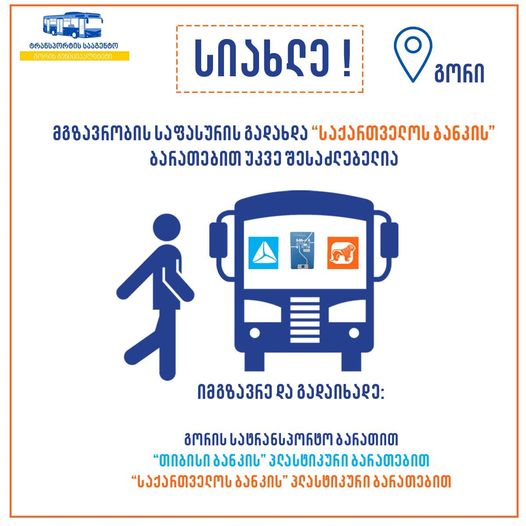 ტრანსპორტის სააგენტოს ინფორმაციით, გორში, საზოგადოებრივი ტრანსპორტით მგზავრობის საფასურის გადახდა ახლა უკვე - გორის სატრანსპორტო ბარათით, „თიბისი ბანკის“ პლასტიკური ბარათებით და „საქართველოს ბანკის“ პლასტიკური ბარათებითაა („AMEX“ ბარათის გარდა) შესაძლებელი.