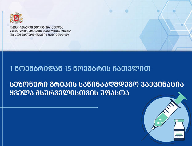 1-ელი ნოემბრიდან 15 ნოემბრის ჩათვლით სეზონური გრიპის საწინააღმდეგო ვაქცინაცია, ყველა მსურველისთვის უფასოა.