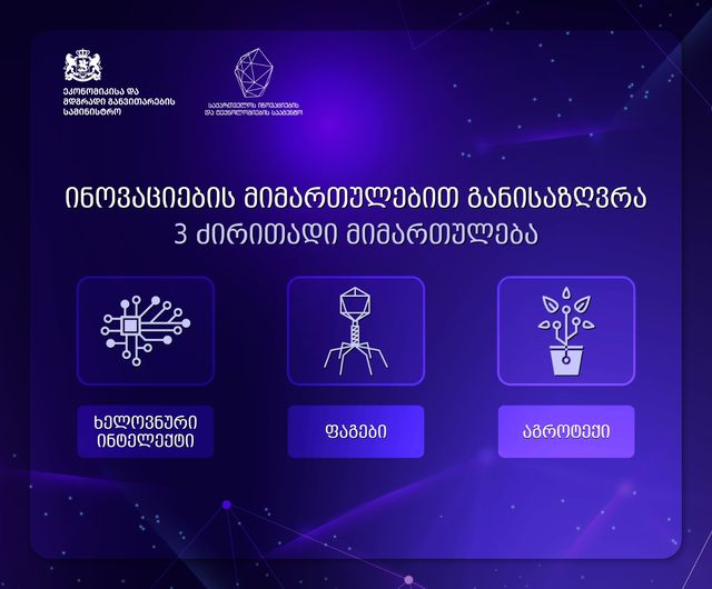 საქართველოში ინოვაციების და ტექნოლოგიების შემდგომი განვითარების მიზნით, ქვეყნის სამი ძირითადი ტექნოლოგიური მიმართულება: ხელოვნური ინტელექტი; ფაგები; აგროტექნოლოგიები განისაზღვრა, - ინფორმაციას აღნიშნულის შესახებ ეკონომიკისა და მდგრადი განვითარების სამინისტრო ავრცელებს.