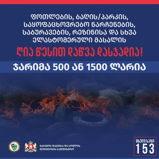 „ნარჩენების მართვის კოდექსის თანახმად, მუნიციპალური არასახიფათო ნარჩენების - ფოთლების, ბაღის/პარკის ნარჩენების, საყოფაცხოვრებო ნარჩენების ღია წესით დაწვა გამოიწვევს დაჯარიმებას 500 ლარის ოდენობით; ხოლო საბურავის, რეზინის და სხვა ელასტომერული მასალის ღია წესით დაწვის შემთხვევაში, სამართალდამრღვევს 1 500 ლარის ოდენობის ჯარიმის გადახდა მოუწევს.