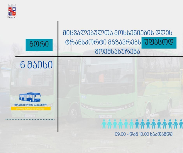 მიცვალებულთა მოხსენიების დღეს, 6 მაისს, დამატებითი ავტობუსები გორში უფასოდ 09:00 - დან 18:00 საათამდე იმოძრავებს.