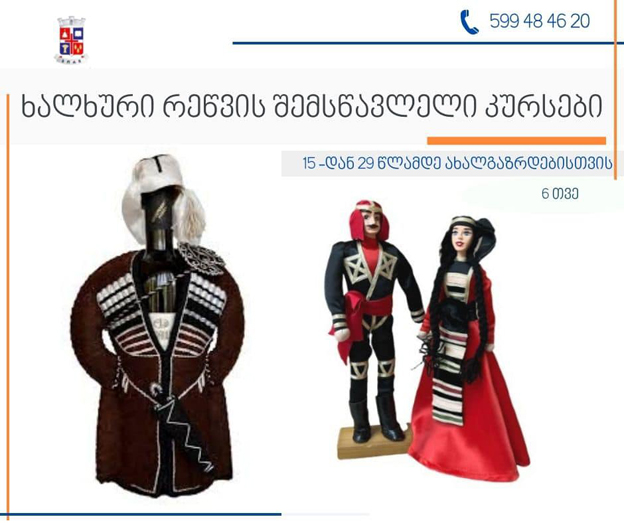 „ექვსთვიანი სწავლის პროცესს სერგი მაკალათიას სახელობის ეთნოგრაფიული მუზეუმის ეზოში განთავსებული სახელოსნო უმასპინძლებს. გაკვეთილები შაბათ - კვირას13:00 საათიდან 16:00 საათამდე გაგრძელდება. კურსებს ხალხური რეწვის ოსტატი მარინე ბეგლარიშვილი გაუძღვება. მონაწილეობის მსურველები დაგვიკავშირდით - 599 48 46 20“, - აცხადებენ მერიაში.