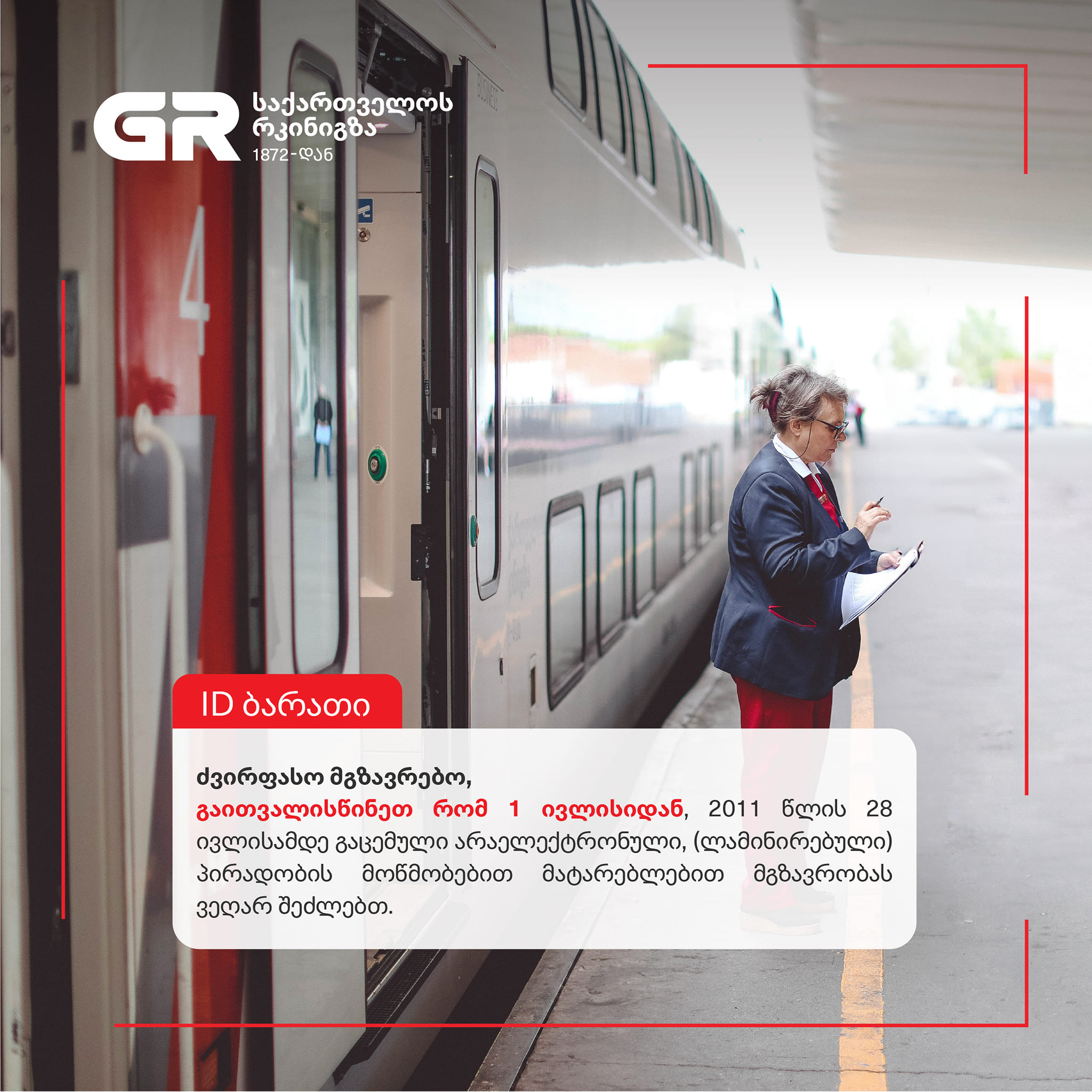 „ძვირფასო მგზავრებო, გაითვალისწინეთ, 1-ელი ივლისიდან არაელექტრონული, ლამინირებული პირადობის მოწმობებით, მატარებლით მგზავრობას ვეღარ შეძლებთ. გამგზავრების წინ, ბილეთის მისაღებად ელექტრონული პირადობის მოწმობები, ე.წ. ID ბარათები უნდა წარადგინოთ“, - ნათქვამია ინფორმაციაში.