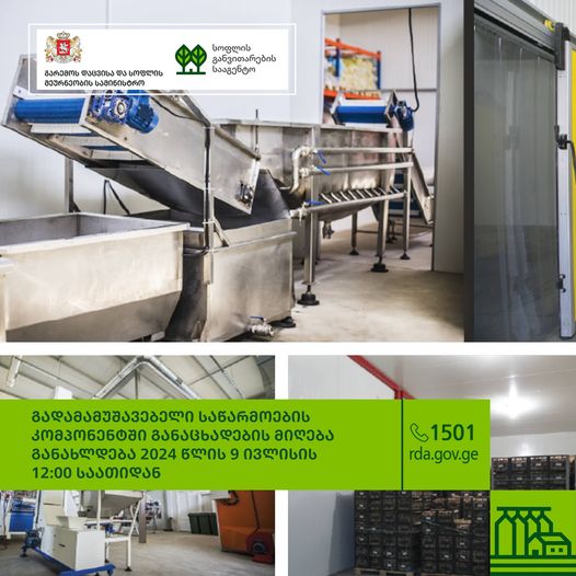 სოფლის განვითარების სააგენტოს ინფორმაციით, გადამამუშავებელი საწარმოების კომპონენტში განაცხადების მიღება 9 ივლისის 12:00 საათიდან განახლდება და განაცხადები 19 ივლისის 18:00 საათამდე მიიღება.