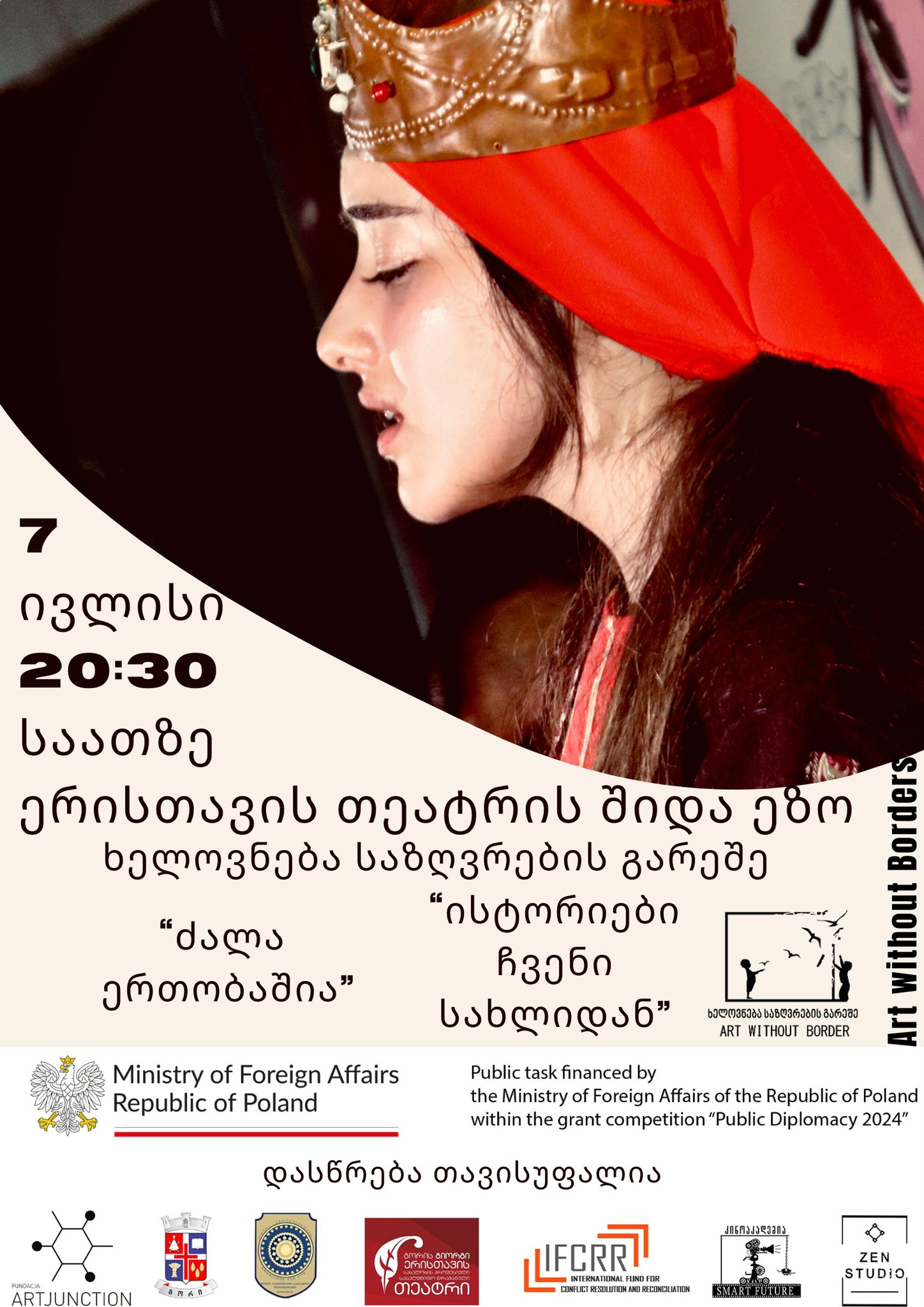 „ძალა ერთობაშია“, „ისტორიები ჩვენი სახლიდან“ - გიორგი ერისთავის სახელობის თეატრის შიდა ეზოში წარმოდგენა 20:30 საათზე დაიწყება.