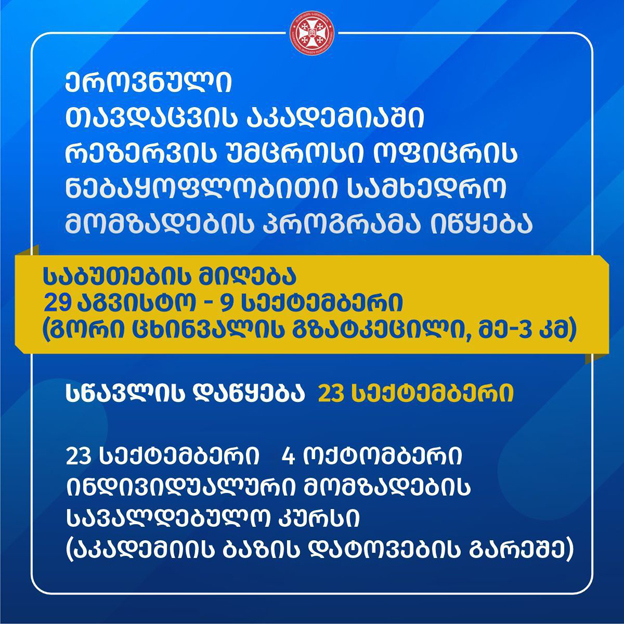 23 სექტემბრიდან დავით აღმაშენებლის სახელობის საქართველოს ეროვნული თავდაცვის აკადემიაში რეზერვის უმცროსი ოფიცრის ნებაყოფლობითი სამხედრო მომზადების პროგრამა იწყება.