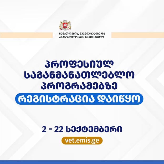 პროფესიულ საგანმანათლებლო პროგრამებზე რეგისტრაცია დაიწყო და 22 სექტემბრის ჩათვლით გაგრძელდება.
