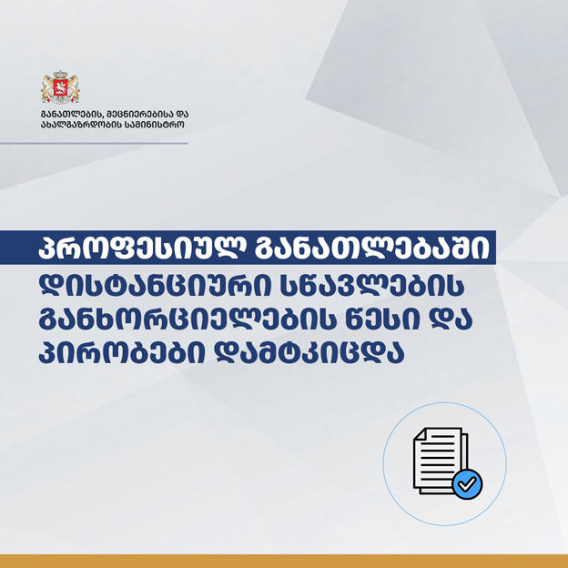 „პროფესიული განათლების შესახებ“ საქართველოს კანონში შესული ცვლილებების საფუძველზე, საქართველოს განათლების, მეცნიერებისა და ახალგაზრდობის მინისტრის ბრძანებით პროფესიულ განათლებაში დისტანციური სწავლების განხორციელების წესი და პირობები დამტკიცდა.
