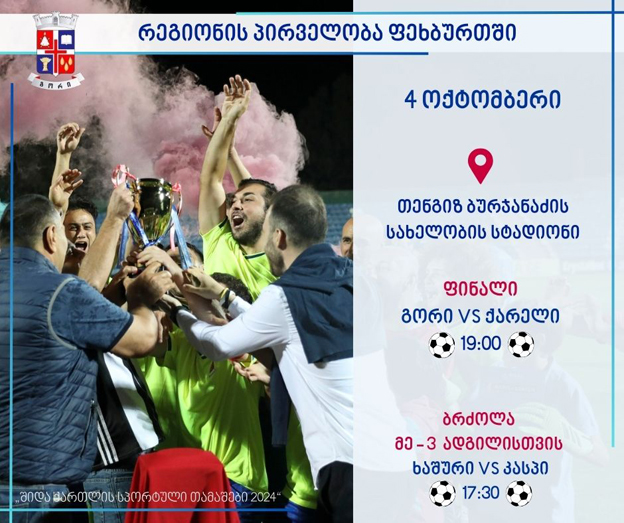 რაც შეეხება მესამე ადგილისთვის ბრძოლას, გორის მუნიციპალიტეტის მერიის ცნობით, მატჩი დღესვე, ხაშურის და კასპის გუნდებს შორის ჩატარდება. თამაში 17:30 საათზე დაიწყება.