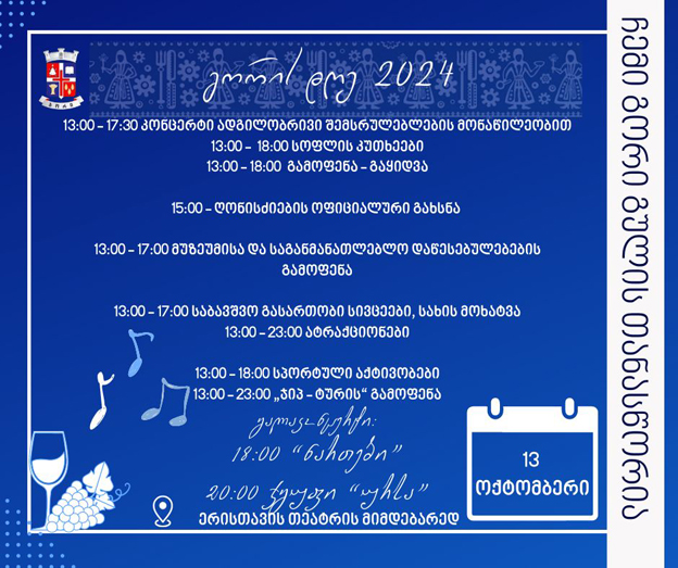 ღონისძიებები 13:00 საათიდან დაიწყება და მოეწყობა მუზეუმების, საგანმანათლებლო დაწესებულებების კუთხეები, ადგილობრივი მეწარმეების პროდუქციის და ხელოვანების ნამუშევრების გამოფენა-გაყიდვა, კვების ობიექტები და სოფლების კუთხეები (ყურძნის დაწურვა, ჩურჩხელების ამოვლება), საბავშვო გასართობი სივრცეები (სახის მოხატვა), ატრაქციონები, სპორტული აქტივობები და ტურისტული კუთხე „ჯიპ - ტური“.