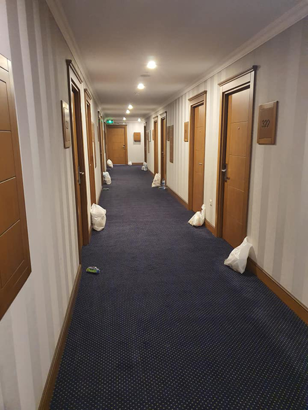სურათებში ნახავთ დერეფანს, ყველა ოთახთან საჭმელი დევს ერთჯერადი თეფშებით და ჭიქებით.