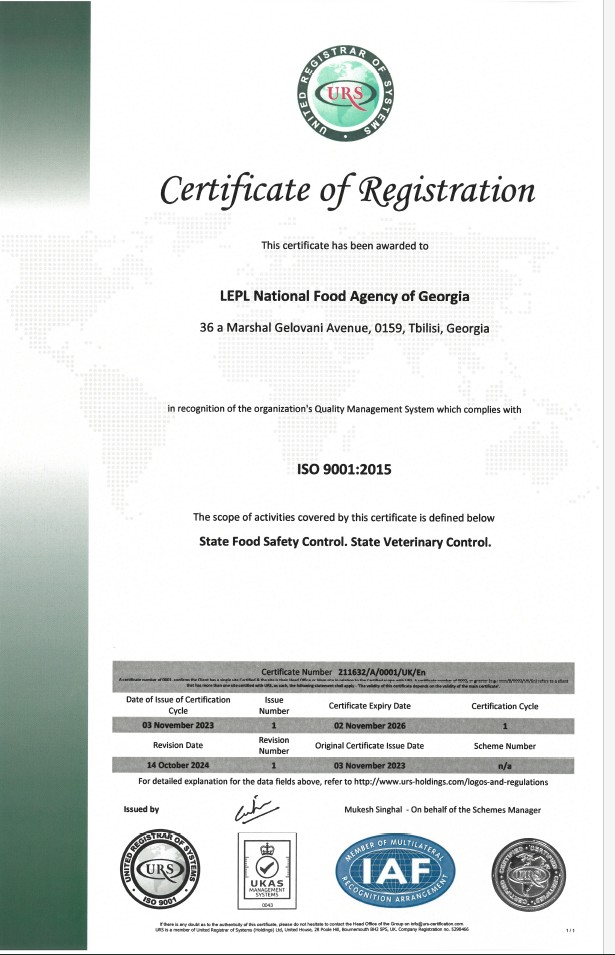 საქართველოს სურსათის ეროვნული სააგენტოს ვეტერინარიის დეპარტამენტს საერთაშორისო აკრედიტაციის მქონე ორგანომ „URS“ (UNITED REGISTAR OF SYSTEMS), მართვის ხარისხის სისტემის ISO 9001:2015-ის სერტიფიკატი მიანიჭა.