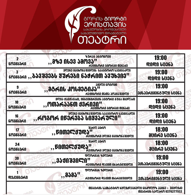 გ. ერისთავის სახელობის თეატრმა ნოემბერში ჩანიშნული სპექტაკლების ანონსი გამოაქვეყნა. როგორც ცნობილია, გორის თეატრის დასი მომდევნო თვის განმავლობაში 8 სპექტაკლს ითამაშებს.