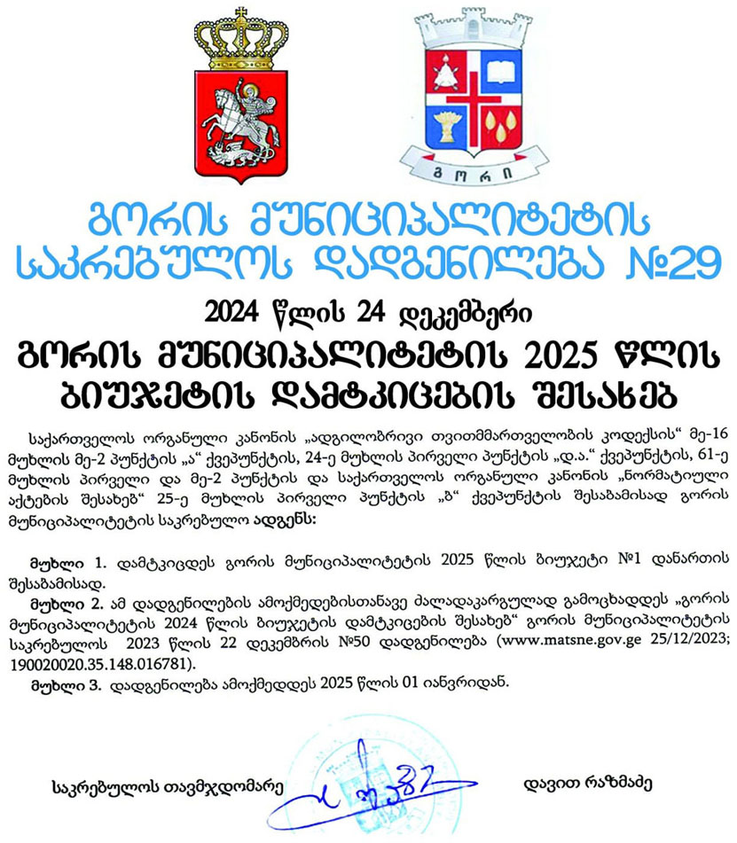 გორის მუნიციპალიტეტის საკრებულოს რიგგარეშე სხდომაზე გორის 2025 წლის ბიუჯეტის დადგენილების პროექტი დაამტკიცეს.