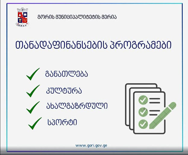 „გორის მერია შემდეგი სახის პროგრამების თანადაფინანსებას უზრუნველყობს: გორის მუნიციპალიტეტის განათლების ხელშეწყობისა და თანადაფინანსების პროგრამა, სპორტული ღონისძიებების/პროექტების ხელშეწყობისა და თანადაფინანსების პროგრამა, კულტურული ღონისძიებების/პროგრამების ხელშეწყობისა და თანადაფინანსების პროგრამადა ახალგაზრდული ღონისძიებების/პროექტების ხელშეწყობისა და თანადაფინანსბეის პროგრამა“, - აცხადებენ გორის მერიაში.
