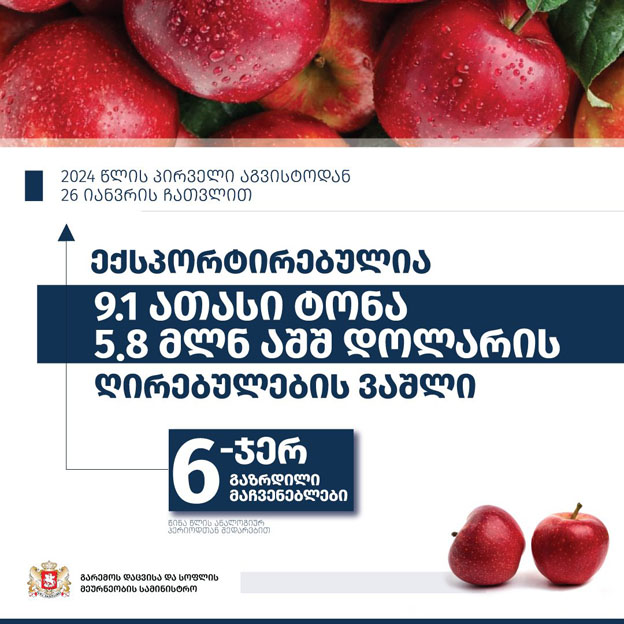 გარემოს დაცვისა და სოფლის მეურნეობის სამინისტროს ინფორმაციით, 2024 წლის 1 აგვისტოდან 2025 წლის 26 იანვრის ჩათვლით, 9.1 ათასი ტონა ვაშლის ექსპორტი განხორციელდა, რომლის ღირებულებამ 5.8 მლნ აშშ დოლარი შეადგინა.