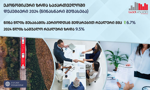 უწყების ინფორმაციით, 2024 წლის დეკემბერში, წინა წლის შესაბამის პერიოდთან შედარებით, ზრდის მიმართულებით მნიშვნელოვანი წვლილი შემდეგმა დარგებმა შეიტანა: საფინანსო და სადაზღვევო საქმიანობები, პროფესიული, სამეცნიერო და ტექნიკური საქმიანობები, ტრანსპორტი და დასაწყობება, ვაჭრობა, ინფორმაცია და კომუნიკაცია. კლების ტენდენცია კი დამამუშავებელი მრეწველობის და სასტუმროების და რესტორნების სექტორში დაფიქსირდა.