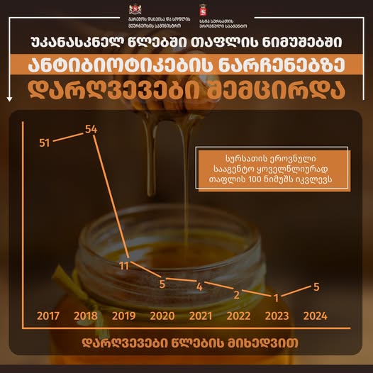 სააგენტოს ინფორმაციით, ლაბორატორიული კვლევის შედეგად, ანტიბიოტიკების ნარჩენები (მეტრონიდაზოლი, ქლორამფენიკოლი, ტეტრაციკლინი) თაფლის 5 ნიმუშში გამოვლინდა და გამოვლენილ დარღვევებთან დაკავშირებით, კანონმდებლობით გათვალისწინებული ზომები გატარდა, ბიზნესოპერატორებს დასახელებული სურსათის რეალიზაცია აეკრძალათ და ბაზრიდან ამოღება დაევალათ, რაზეც ზედამხედველობა სურსათის ეროვნულმა სააგენტომ განახორციელა.