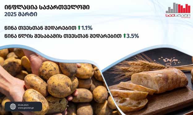 2025 წლის მარტში, წინა თვესთან შედარებით, ინფლაციის დონემ საქართველოში 1.1 პროცენტი, ხოლო წლიური ინფლაციის დონემ 3.5 პროცენტი შეადგინა, - ინფორმაციას საქართველოს სტატისტიკის ეროვნული სამსახური ავრცელებს.