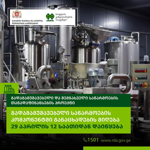 გადამამუშავებელი საწარმოების თანადაფინანსების კომპონენტში განაცხადები 29 აპრილის 12:00 საათიდან მიიღება და 13 მაისის 18:00 საათამდე გაგრძელდება.